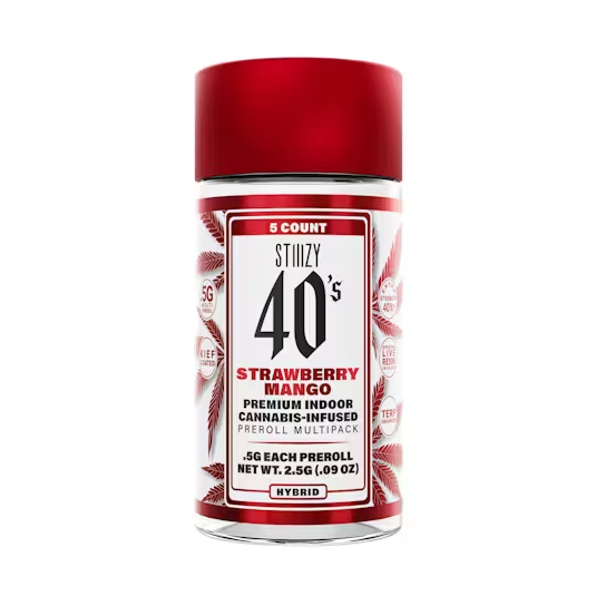 The STIIIZY 40’s Strawberry Mango multipack offers five 0.5G infused prerolls made from premium cannabis flower infused with live resin and coated with kief. Known for its tropical notes and ripe, flavor-forward profile, this sativa-dominant lineup delivers a balance in every roll, designed for convenience without compromise.