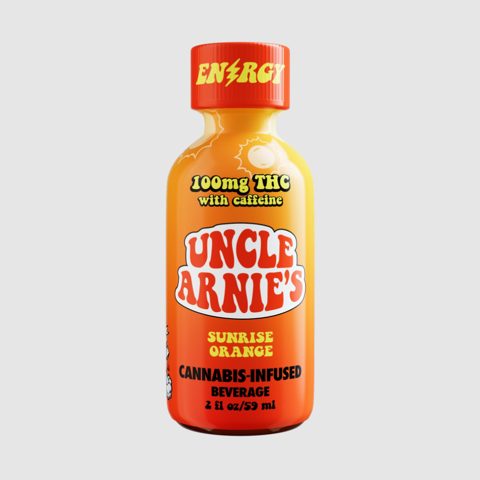 Rise and shine with the Uncle Arnie's 100mg THC Sunrise Orange Shot. This two ounce shot, has Sunny D vibes and is packed with 150mg of Caffeine. Try skipping that coffee and adding this to your morning smoothie. Perfect for that on-the-go morning hustle. Just like the classic 8 ounce drinks, these are infused with nano-emulsion technology. You can control your high or get as lit as you want by using the dosed measurement system. Expect your rocket to blast off in 20-40 minutes.